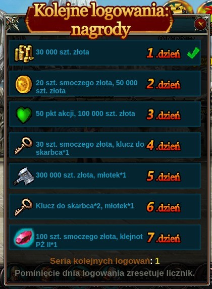 Pamiętajcie jednak, że jeśli z jakiś powodów kolejnego dnia nie uda wam się zalogować do gry to liczni serii kolejnych logowań ustawia się na 1, czyli resetuje, a zbieranie nagród zaczynamy od dnia pierwszego. Warto systematycznie wchodzić do gry, gdyż mamy szansę na duże ilości smoczego złota jak i zwykłego złota czy punkty akcji, a nawet klucze do skarbców.