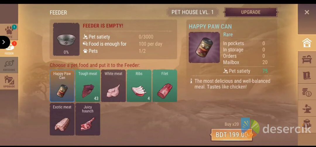 W miarę jak zwierzę rośnie, jego apetyt zwiększa się, a karmnik musi być ulepszany, aby sprostać jego potrzebom. Ten aspekt wprowadza element regularnej opieki i strategii – musisz planować polowania i zdobywanie zasobów, aby twój pupil nie cierpiał z głodu.